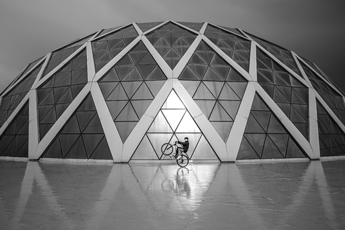 Bu keyifli fotoğraf eğlencesinde ödüle değer görülen "Bisiklet" isimli fotoğraf, mimarinin mühendislik ve geometri ile olan kopmaz bağını en saf haliyle gözler önüne seriyor. Fotoğrafçı, geodezik bir kubbenin tam merkez aksına yerleşerek, üçgenlerin oluşturduğu devasa deseni kusursuz bir simetriyle kadrajına sığdırmış. Siyah-beyaz tercihiyle formun ve dokunun gücünü vurgulayan fotoğrafçı, izleyiciyi renklerin karmaşasından uzaklaştırarak geometrinin estetiğine davet ediyor.