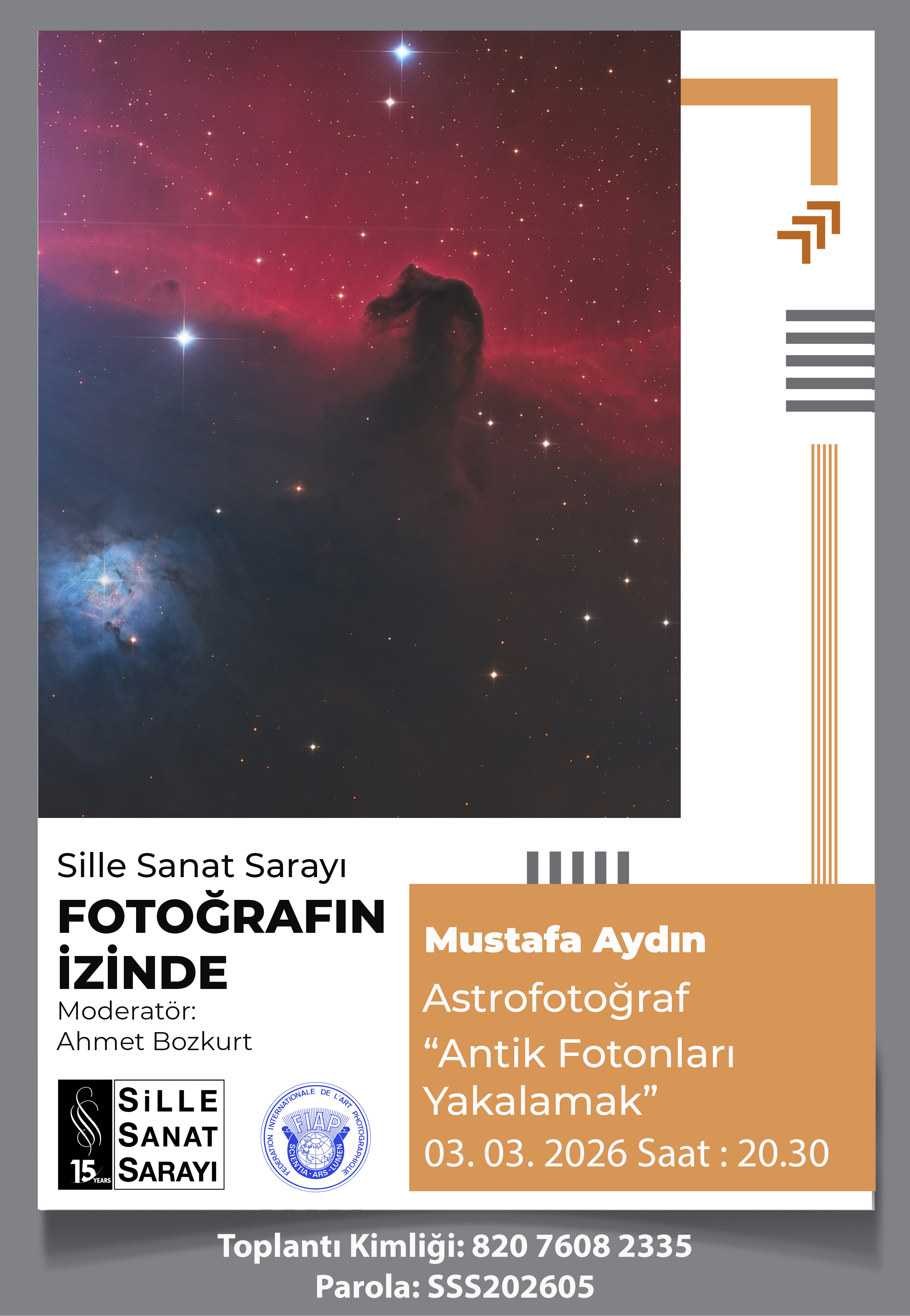 Sille Sanat Sarayı’nın gelenekselleşen "Fotoğrafın İzinde" programı, bu hafta çok özel bir konuğu ve büyüleyici bir konuyu ağırladı. Uzun yıllardır gökyüzünün gizemini vizörüne taşıyan değerli fotoğraf sanatçısı Mustafa Aydın, programımızın konuğu olarak bizlerle bir araya geldi.